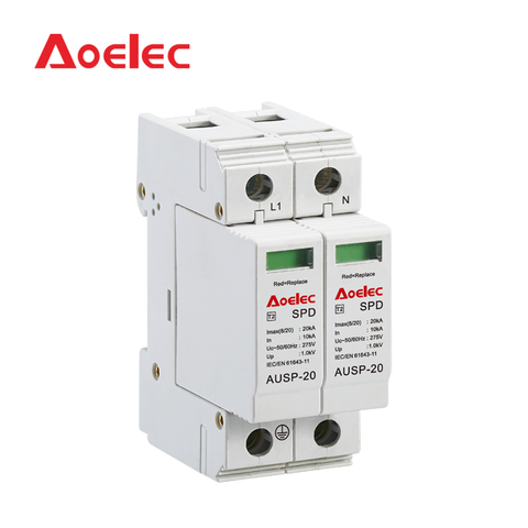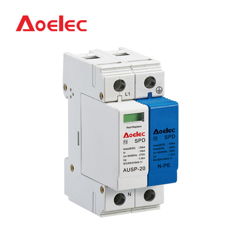 Aolec AUSP-20 모듈식 딘 레일 서지 보호 장치 (SPD) 2P CE 인증 IP20 10kA 내화 PA66 인클로저 <25ns